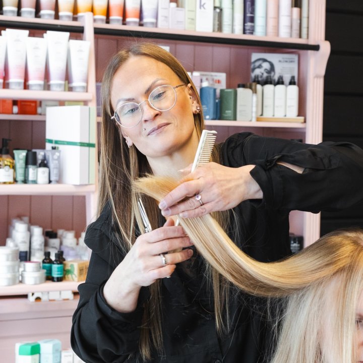 Sari Elo luo kauniita leikkauksia ja henkeäsalpaavia kampauksia asiakkailleen.